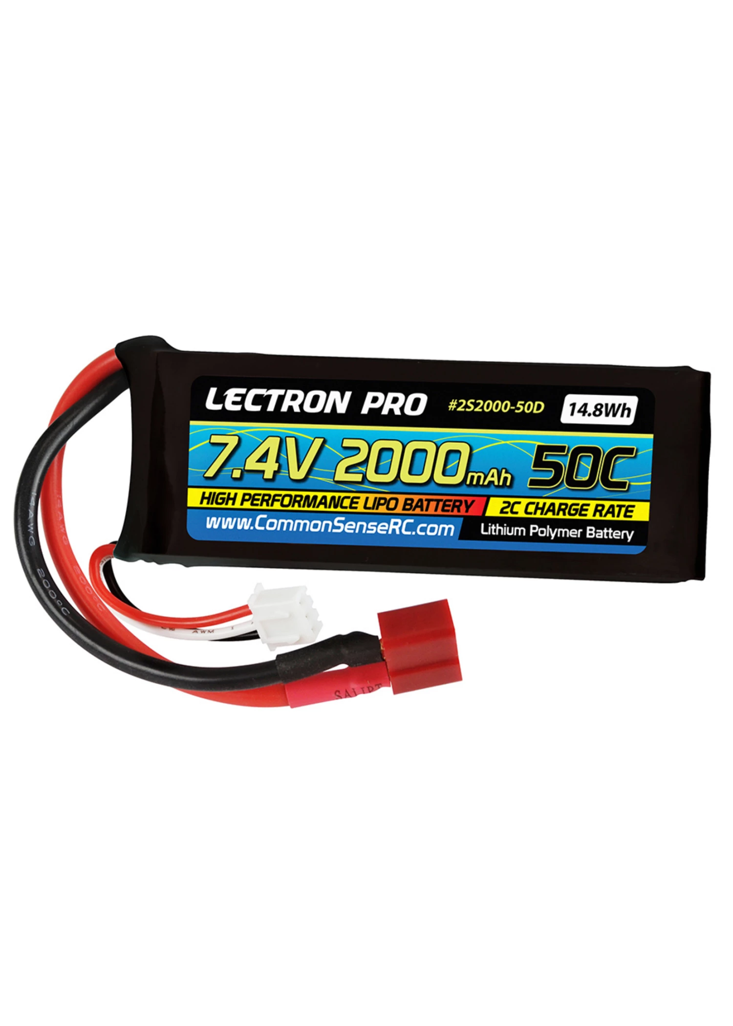 This 2-cell Lithium Polymer 2000mAh battery pack is the perfect size, shape and weight for tons of 1/16 and 1/18 scale cars and trucks, and the 50C discharge rate gives you the top-end power and performance you desire. It’s also a great choice for mid-size park flyer airplanes. 50C continuous discharge rate of 100 amps. Comes with Deans-type connectors on the discharge leads.