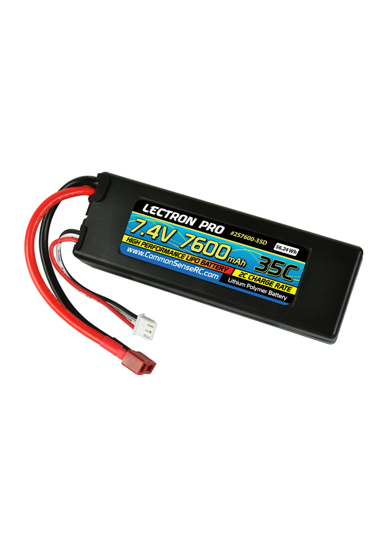 This 2-cell 7.4V 7600mAh 35C lipo is the same size as a standard 5000mAh lipo, perfect for 1/10 scale cars, trucks, and buggies! The huge 7600mah capacity means massively extended run times and the 35C continuous discharge rating means you’ll get great punch and top-end speed. Includes a Deans-type connector on the discharge leads.