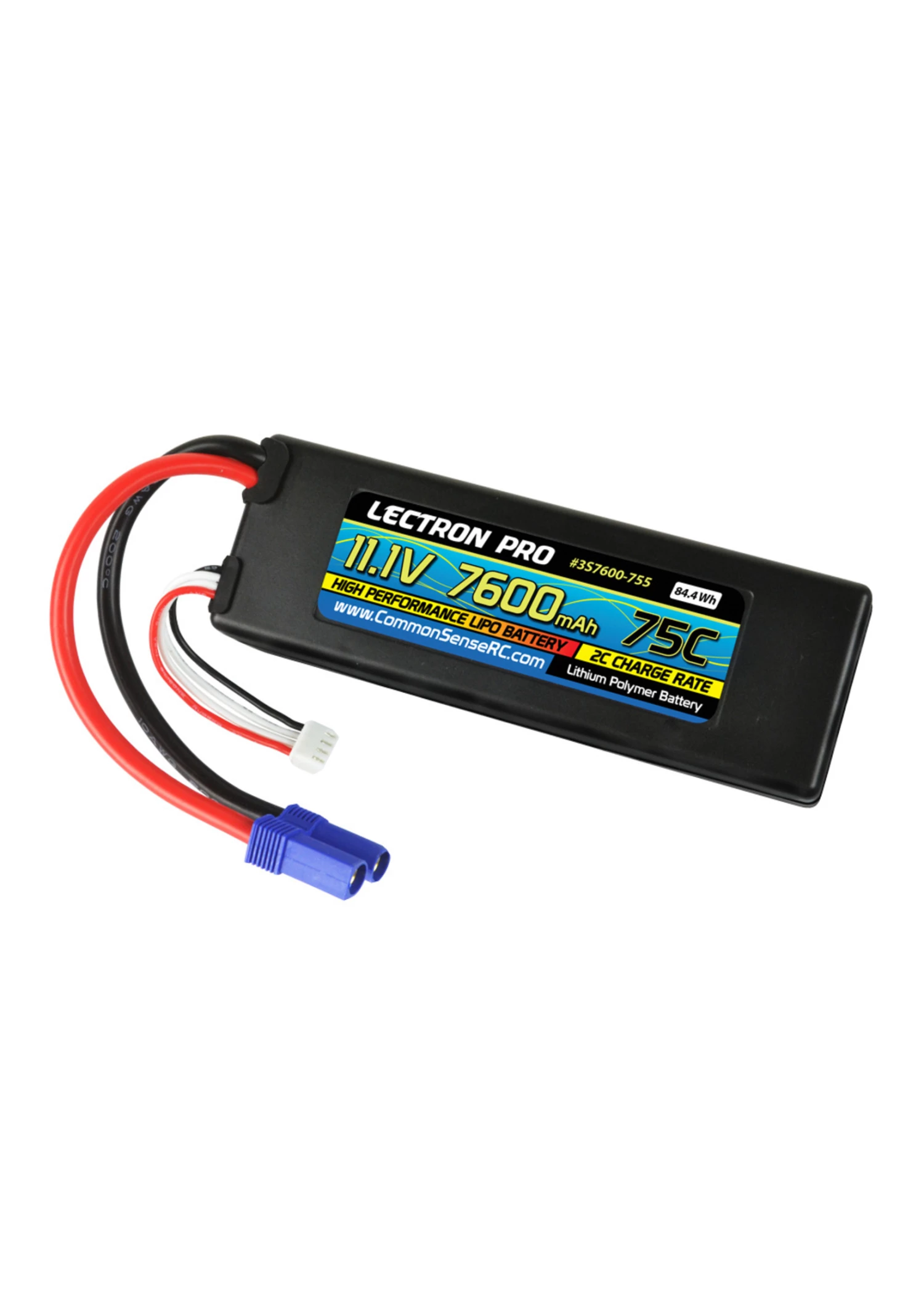 This 3-cell 11.1V 7600mAh 75C lipo is perfect for 1/10 scale cars, trucks, and buggies! The huge 7600mah capacity means massively extended run times and the 75C continuous discharge rating means you’ll get the ultimate in speed and torque. Includes an EC5 connector on the discharge leads.
