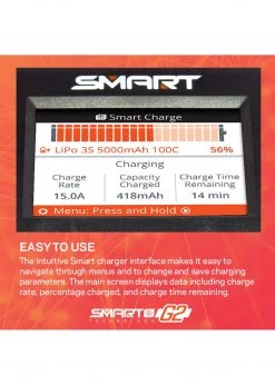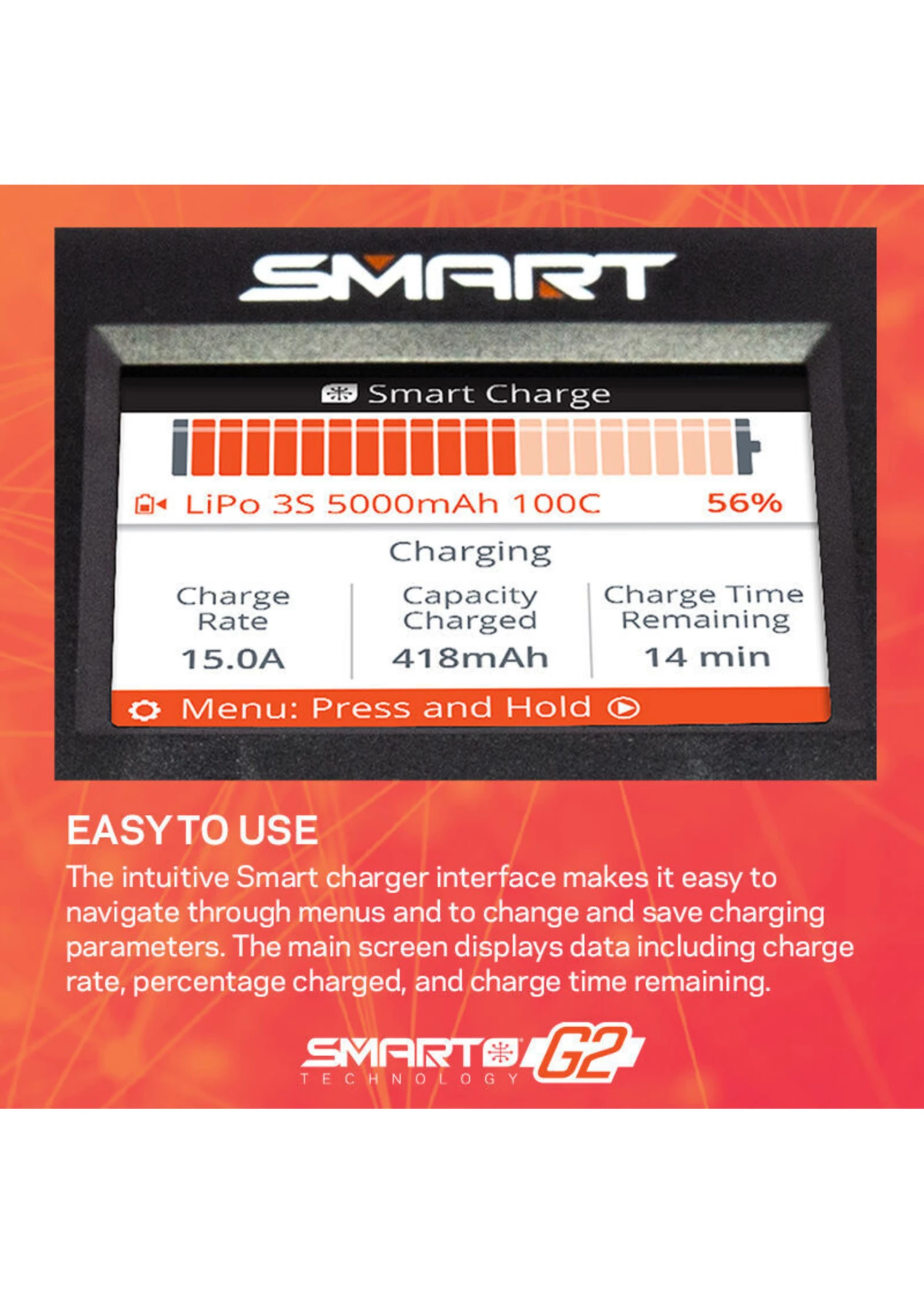For example, Spektrumâ„¢ Smart G2 technology makes it much easier to balance charge your LiPo batteries. Balancing information travels through the unique data wire of each Smart G2 battery’s innovative IC3® or IC5® connector. As a result, only a single connection is needed — no separate balance lead is required.